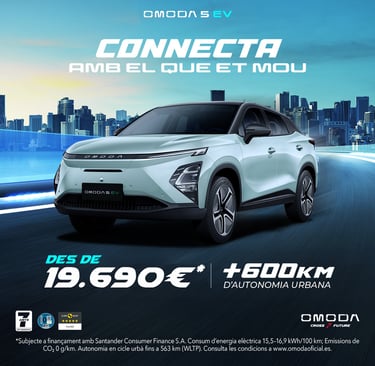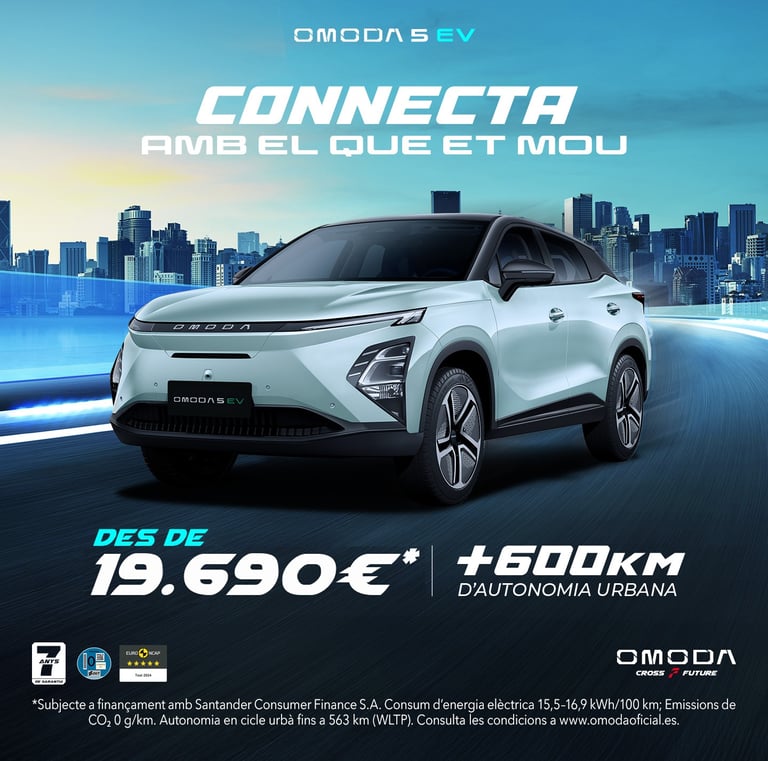 *PVP recomanat a la Península i Balears per a l’Omoda 5 MY26 EV Pure 155 kW (211 CV) amb bateria de 61 kWh (IVA, impostos de matriculació, transport, descompte de la marca i del concessionari, descompte per permuta, descompte Black November, descompte per finançament amb Santander Consumer Finance S.A. i subvenció del Pla Moves III**, inclosos en l’oferta). El PVP recomanat amb finançament inclou 7.000 € de subvenció del Pla Moves III amb desballestament. El client podrà sol·licitar l’avançament d’aquesta ajuda vinculada al finançament amb Santander Consumer Finance S.A. En cas de no rebre-la, s’haurà d’abonar igualment a l’entitat en un màxim de 12 mesos. PVP recomanat amb finançament sense Pla Moves III: 26.690 €. Sistema d’amortització francès. Finançament ofert, subjecte a estudi i aprovació per part de Santander Consumer Finance, S.A. Oferta vàlida per a clients particulars que financin a través de Santander Consumer Finance, S.A., segons les condicions actuals, amb un capital mínim de 18.000 € i amb una durada i permanència mínima del finançament de 36 mesos. Campanya incompatible amb altres ofertes financeres. Oferta vàlida fins al 30/11/2025 i subjecta a disponibilitat d’estoc. Garantia comercial de 7 anys o 150.000 km (el que passi primer), segons el Manual de Garanties. No inclou les despeses de matriculació ni de prelliurament. Consum d’energia elèctrica (kWh/100 km): 15,5–16,9; emissions de CO₂ (g/km): 0 g. Autonomia combinada (bateria de 61 kWh): 402–430 km. Autonomia en cicle urbà: fins a 563 km (valors WLTP). Per a més informació, consulta el teu Concessionari Oficial OMODA.